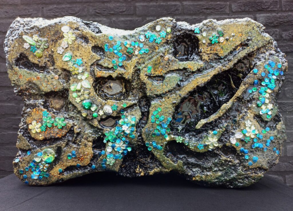 Daar tegenover staan de glinsterende pailletten en fonkelende versieringen, verspreidt over het oppervlak. Deze felgekleurde, onnatuurlijke elementen in tinten van turquoise, blauw en groen, symboliseren de menselijke drang naar pracht, glamour en overdaad. Ze lijken bijna willekeurig ingevoegd in het natuurlijke materiaal, als een poging om de aarde te verfraaien of toe te eigenen.