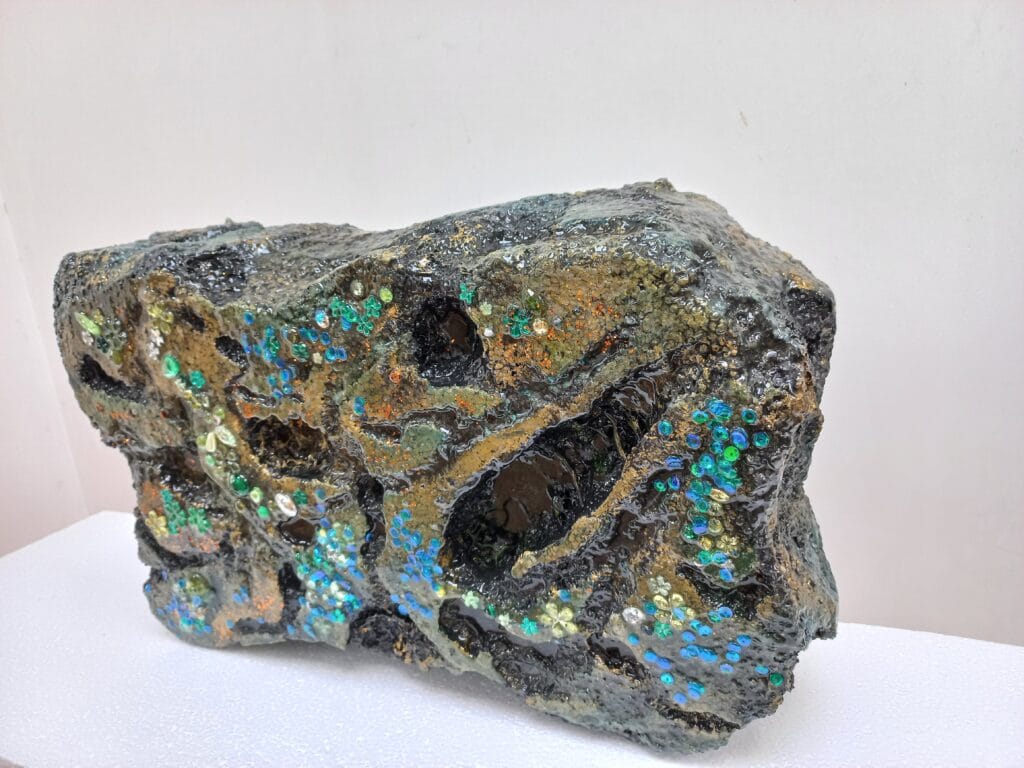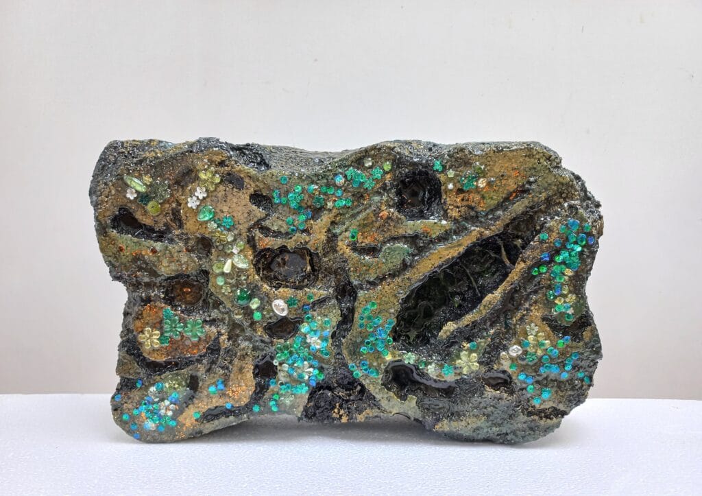 In contrast, glittering sequins and sparkling embellishments are scattered across its surface. These brightly colored, unnatural elements in shades of turquoise, blue, and green, symbolize the human urge for splendor, glamour, and excess. They appear almost randomly embedded within the natural material, as if attempting to adorn or lay claim to the earth.