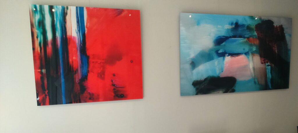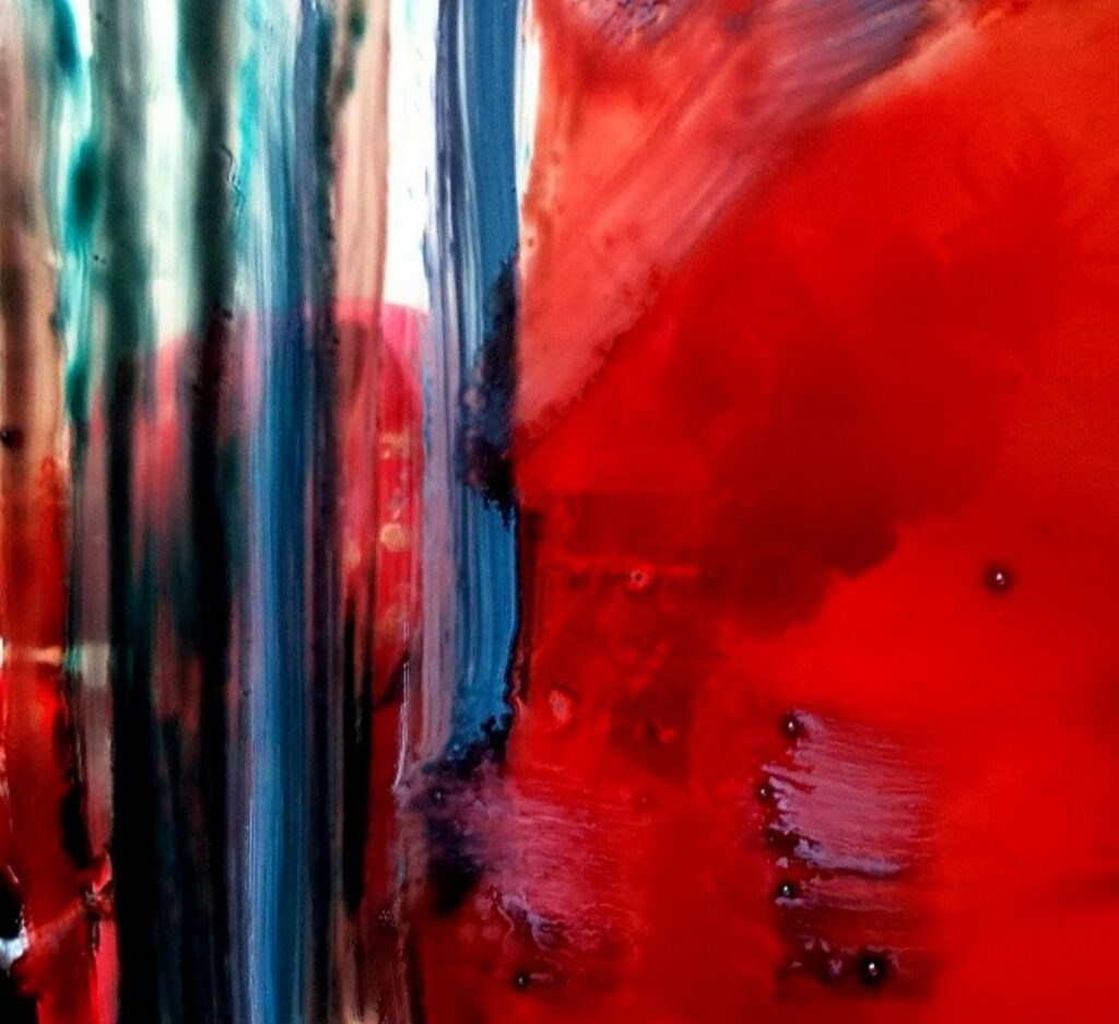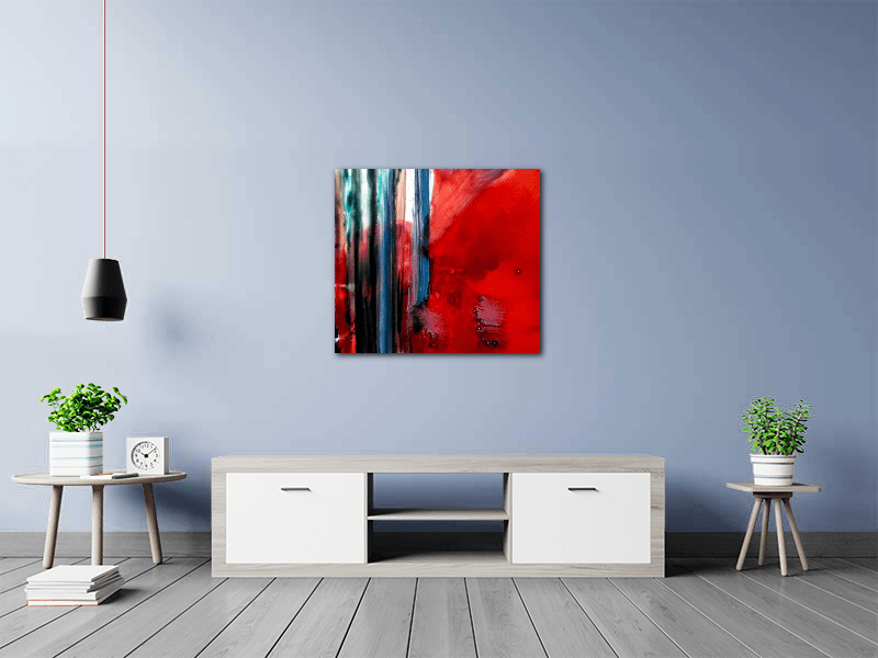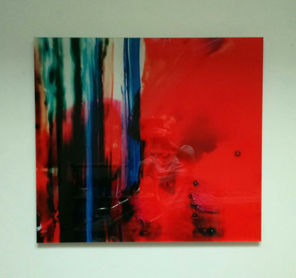 Serie From selfie to art, mixed media print op plexiglas met als title Human mask red, aan wand by Artangeel.com