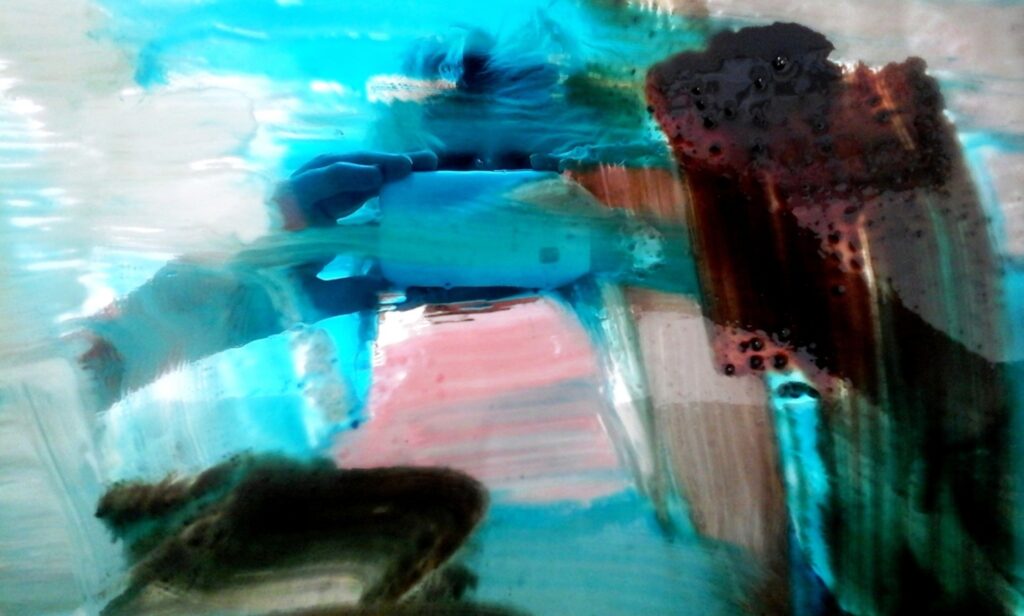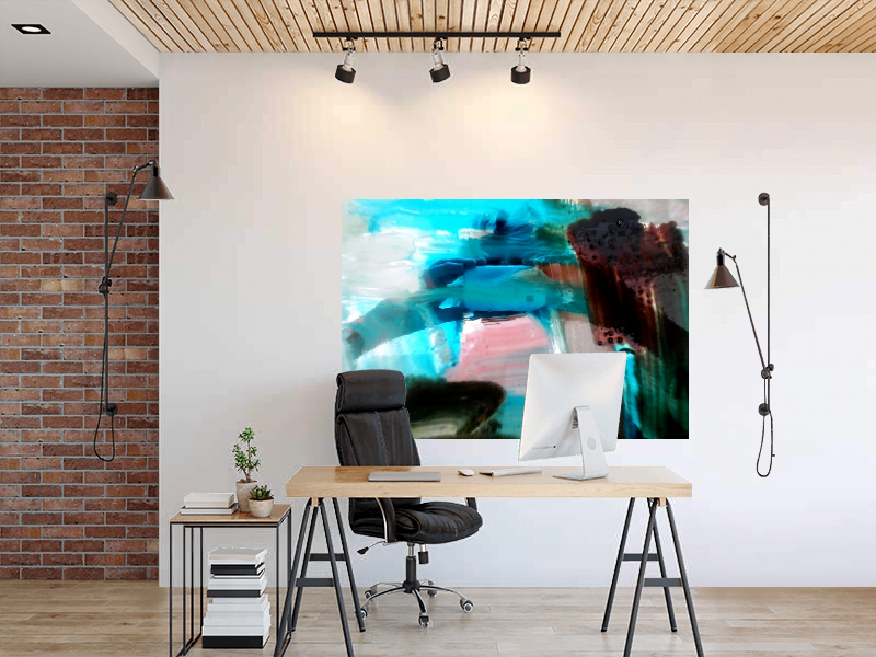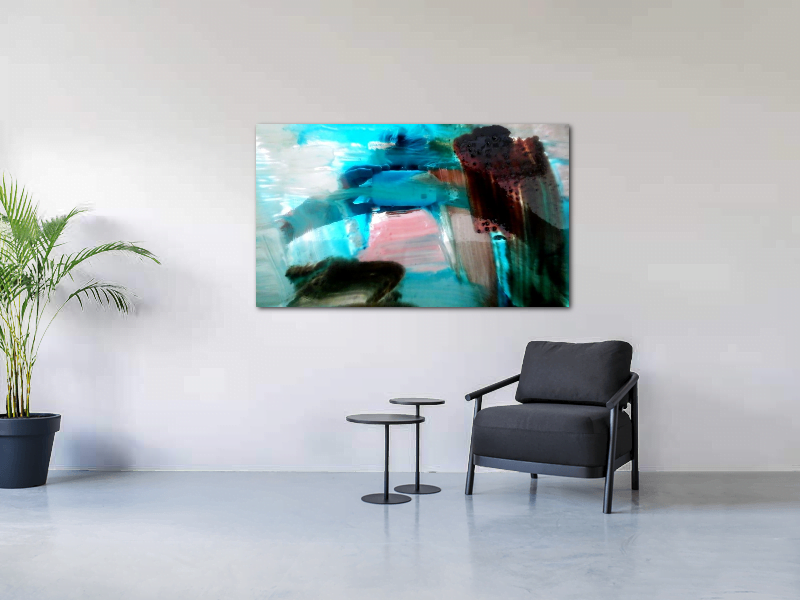 Schilderij in interieur. Intense kleuren geprint op plexiglas. Titel Selfie sea. Intense kleuren in het schilderij by Artangeel.com beeldend kunstenaar Angelika Poels